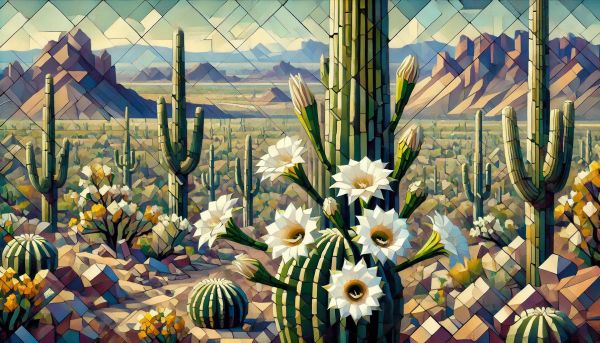 This vibrant artwork offers a unique take on Tucson's desert landscape, capturing its essence through a mosaic of geometric shapes. Tall saguaros dominate the foreground, adorned with radiant white blooms, contrasting sharply with the structured, multi-toned mountains in the distance. The use of sharp lines and angular forms creates an almost crystalline effect, enhancing the natural ruggedness of the desert scenery. The color palette, rich in earthy tones, evokes the warmth and diversity of life in arid environments. This piece blends natural beauty with an abstract art style to celebrate Tucson's picturesque terrain.