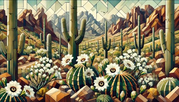This captivating artwork portrays a geometric interpretation of Tucson's desert landscape, showcasing its iconic saguaro cacti and rugged mountain backdrop. The composition is rendered using a vivid, stylized approach, emphasizing sharp angles and a mosaic-like appearance that brings a modern twist to the natural scenery. Rich earthy tones blend with the green hues of the cacti and pops of white from the blooming flowers, creating a visually engaging scene that pays homage to the unique beauty of the Arizona desert.