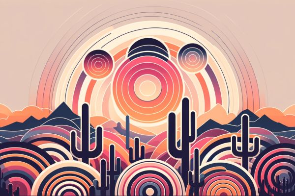 This unique artwork offers an abstract interpretation of Tucson's desert scene, creatively represented through circular shapes and enticing halos. At the heart of the composition, the iconic Saguaro cacti stand tall among undulating hills, under an oversized sun made up of radiant circles. This piece beautifully captures the essence of the Tucson landscape, transforming familiar desert elements into a vibrant tapestry of colors and forms. With its harmonious palette and compelling geometric patterns, the artwork invites viewers to explore a stylized version of nature's splendor in Arizona.