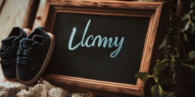 Capturing the essence of joyful anticipation, a charming wooden frame encloses a blackboard displaying the name "Ulamy" in elegant, cursive blue chalk. This intimate scene is softly illuminated, highlighting a pair of tiny, adorable sneakers placed thoughtfully beside the frame. Emanating warmth and personalization, the image is layered with textures from the natural wood grain to the coarse weave of the fabric underneath, evoking a sense of homespun charm and expectancy. Beside the frame, lush green leaves add a touch of freshness, symbolizing new life and growth. This decor setup is not just a beautiful arrangement but a poignant representation of the excitement and preparation that precedes the arrival of a new life into the world. Such a setting is perfect for a baby shower, where memories are made and future hopes are celebrated. Artfully composed, this image uses soft focus and depth of field to draw attention to the main subjects, creating a nostalgic and tender atmosphere that can be felt by anyone who views it.