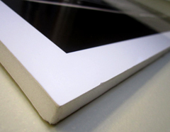 Plaque mounts have a neat, bevelled edge that can be coated with one of 17 different colors or textures. A keyhole slot is di-cut into the top back of the plaque for easy mounting. The result is a clean, frameless display with a very subtle border created by the bevelled edge.