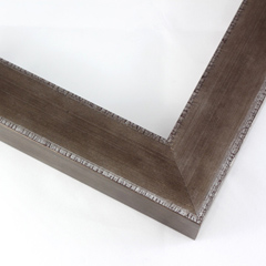 Slightly angled 1-5/8 " frame with an indented design on the inner and outer edge. The face is a metallic silver stain, brushed over a warm grey-brown base. The accented inner and outer edge reveal more of the bright silver color and highlight the difference in texture.